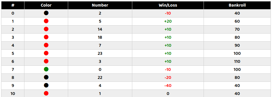 In this example, the base bet is 10 and we bet on red (odds = 2), the martingale is trigerred in the first drawing, we lose. After the loss, the base bet is multiply by 2, then the next drawing we win, recovering the loss with in addition the winning base 10